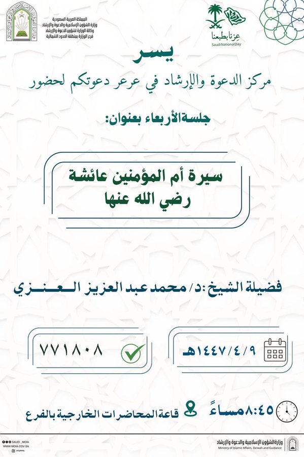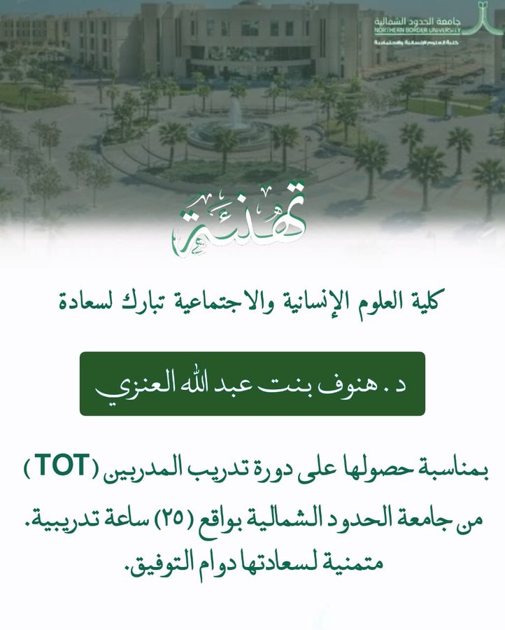أدعوكم جميعًا إلى استثمار الفرص المتاحة في قسمنا، والعمل جنبًا إلى جنب نحو تحقيق أهدافنا المشتركة. فلنكن جميعًا داعمين لبعضنا البعض في هذه الرحلة العلمية المباركة، فمعًا سنبني مستقبلًا مشرقًا يسهم في رفعة ديننا ومجتمعنا، في ظل قيادة حكيمة رشيدة لم تألوا جهدا في خدمة مواطينها ودينيها، وفقنا الله وإياكم لما فيه الخير.